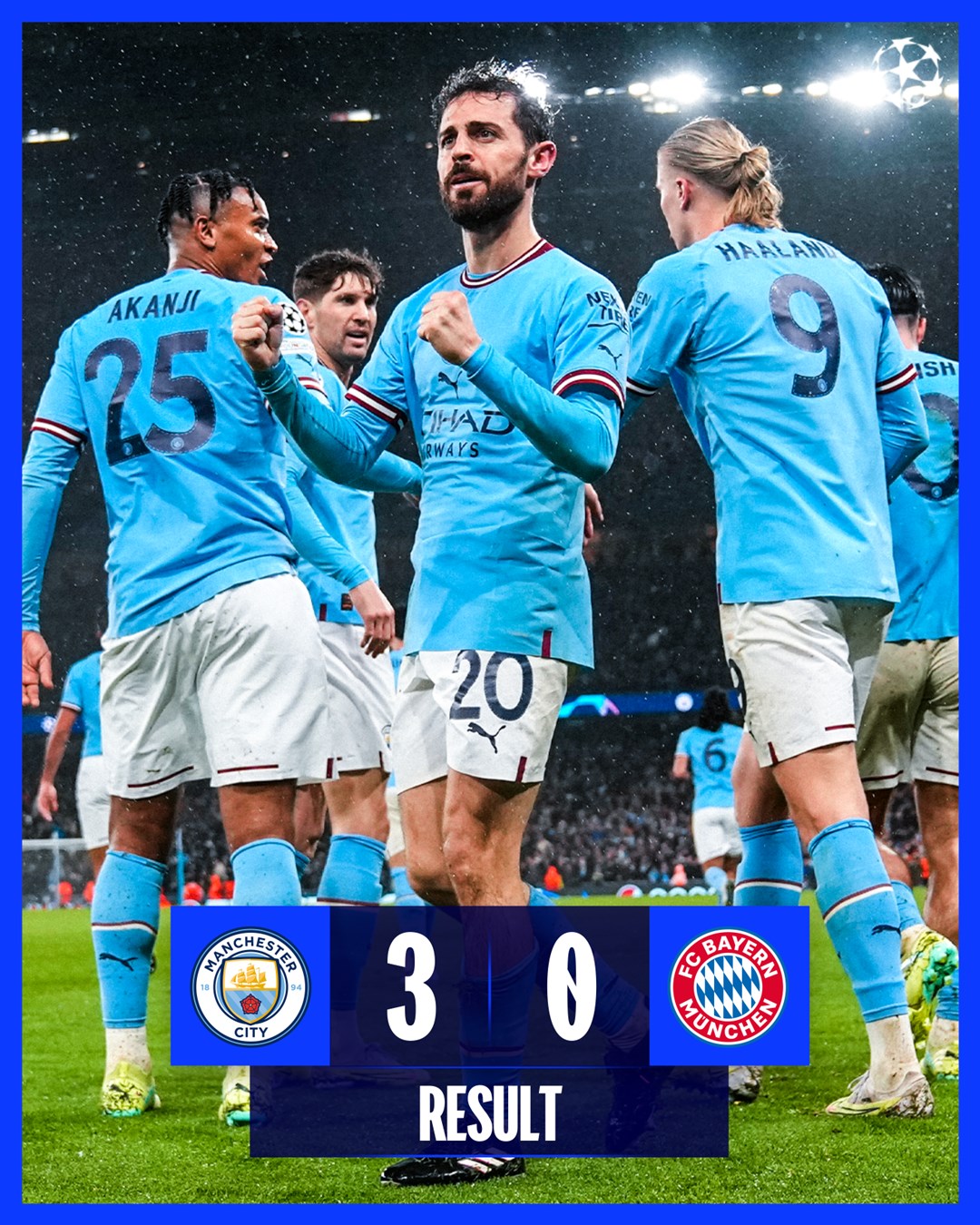 후반 25분 뮌헨의 우파메카노의 실책으로 공을 가로챈 홀란이 골대를 향해 발빠르게 돌진했고, 베르나르도 실바가 강력한 헤딩으로 추가골을 터뜨렸다..