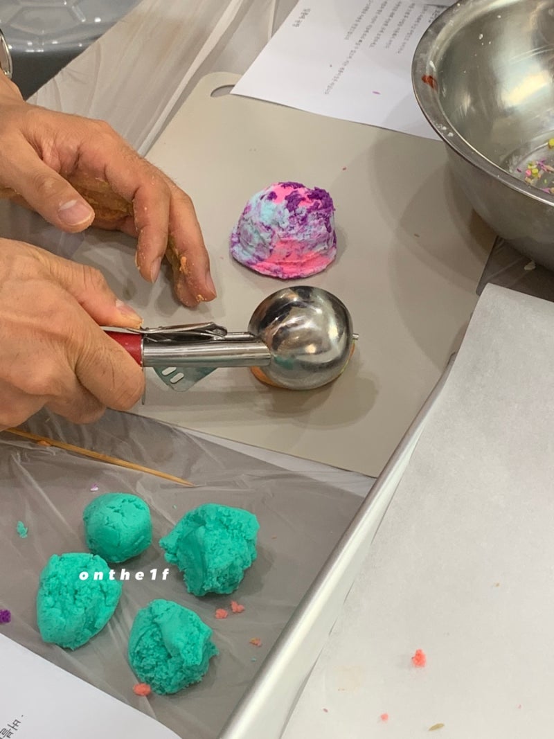 반죽은 함께한 후 소분해서 롤링타입 입욕제를 각각 만들어주셨어요!! 설거지를 하기 위해 물을 묻혀 수강생분들께 보여드렸습니다.^^거품이 매우 풍부한 입욕제입니다~보습제도 들어있어 입욕 후 건조하지 않습니다.^^