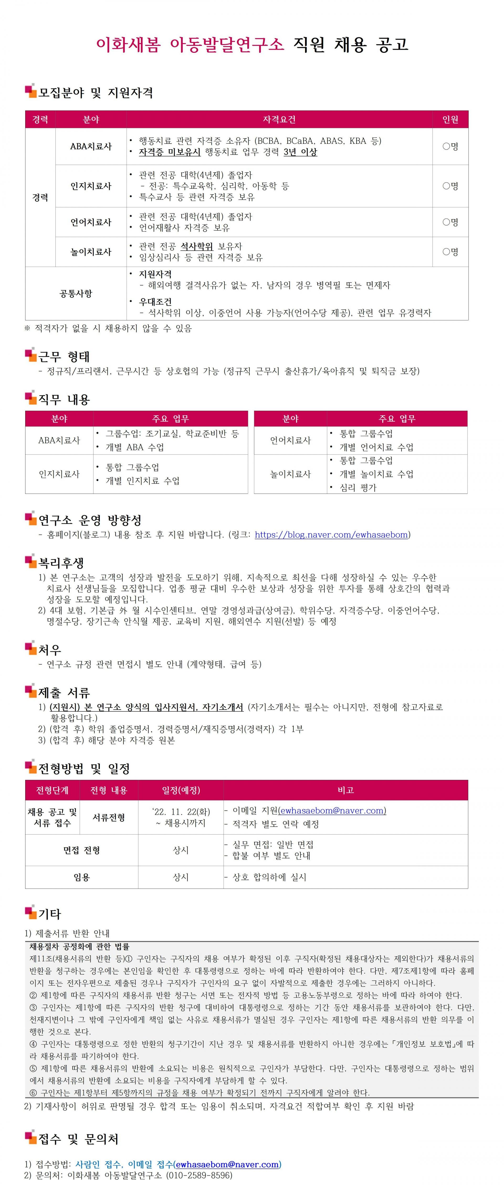 구인정보(채용정보)·모집직종미술심리상담사·근무형태계약직·근무지 경기 고양 덕양·모집인원1명·급여조건 협의 후 결정·경력제한 없음·성별여자·나이 45세 미만·접수기간 채용시 2023년 1월 1일까지상세 요강 안녕하세요. 저희는 보건 복지부 인가 기간에 자갈 자갈 사회적 협동 조합입니다. 현재 예비 사회적 기업으로서 성장 과정에 있는 발달 지원 센터를 함께 운영하고 있습니다. 당기관은 현재 ABA치료, 인지 치료로 아이들을 만나고 있습니다. 발달 지원 센터의 운영 확대로 언어 치료와 인지 치료의 선생님 둘을 모시겠습니다.^^◇ 모집 분야:미술 치료사 ◇ 업무 내용:치료 및 상담/데스크의 선생님이 계셔서, 수업만 가세요^^◇ 자격 요건:관련 전공 및 자격 소유 ◇ 근무 조건:-화요일, 수요일, 금요일, 토요일 근무가 가능하고, 시간은 협의 가능합니다. -2대 보험/4대 보험 가입도 가능합니다.-수수료는 선생님 60%:센터 40%로 3개월의 수습 기간이 있습니다. -근무 시작:2022년 2월 초~논의 가능-현재 대기 아동이 있습니다.(수업 스케줄 보장)◇ 전형 절차:서류 제출-면접-결과*서류 제출 시 꼭 메일을 넣어 주세요.^^◇ 제출 서류:이력서, 자기 소개서, 관련 자격증, 졸업 증명서 ◇ 주소:경기도 고양시상세요강 안녕하세요 저희는 보건복지부 인가 기간으로 자갈 사회적 협동조합입니다. 현재 예비사회적기업으로 성장과정에 있으며 발달지원센터를 함께 운영하고 있습니다. 저희 기관은 현재 ABA 치료, 인지 치료로 아이들을 만나고 있습니다. 발달지원센터 운영 확대로 언어치료와 인지치료 선생님 두 분 모십니다.^^ ◇모집분야 : 미술치료사 ^^◇ 업무내용 : 치료 및 상담/데스크 선생님이 계시니 수업만 진행해주세요 ◇ 자격요건 : 관련전공 및 자격소유 ◇ 근무조건 : – 화요일, 수요일, 금요일, 토요일 근무가 가능하며 시간은 협의 가능합니다. – 2대보험/4대보험 가입도 가능합니다.- 수수료는 선생님 60% : 센터 40%이며 3개월 수습기간이 있습니다. – 근무시작 : 2022년 2월초~ 협의가능 – 현재 대기아동이 있습니다. (수업일정 보장) ◇ 전형절차 : 서류제출 – 면접 – 결과 * 서류제출시 반드시 문자를 넣어주시기 바랍니다.^^◇ 제출서류 : 이력서, 자기소개서, 관련자격증, 졸업증명서 ◇ 주소 : 경기도 고양시상세요강 안녕하세요 저희는 보건복지부 인가 기간으로 자갈 사회적 협동조합입니다. 현재 예비사회적기업으로 성장과정에 있으며 발달지원센터를 함께 운영하고 있습니다. 저희 기관은 현재 ABA 치료, 인지 치료로 아이들을 만나고 있습니다. 발달지원센터 운영 확대로 언어치료와 인지치료 선생님 두 분 모십니다.^^ ◇모집분야 : 미술치료사 ^^◇ 업무내용 : 치료 및 상담/데스크 선생님이 계시니 수업만 진행해주세요 ◇ 자격요건 : 관련전공 및 자격소유 ◇ 근무조건 : – 화요일, 수요일, 금요일, 토요일 근무가 가능하며 시간은 협의 가능합니다. – 2대보험/4대보험 가입도 가능합니다.- 수수료는 선생님 60% : 센터 40%이며 3개월 수습기간이 있습니다. – 근무시작 : 2022년 2월초~ 협의가능 – 현재 대기아동이 있습니다. (수업일정 보장) ◇ 전형절차 : 서류제출 – 면접 – 결과 * 서류제출시 반드시 문자를 넣어주시기 바랍니다.^^◇ 제출서류 : 이력서, 자기소개서, 관련자격증, 졸업증명서 ◇ 주소 : 경기도 고양시