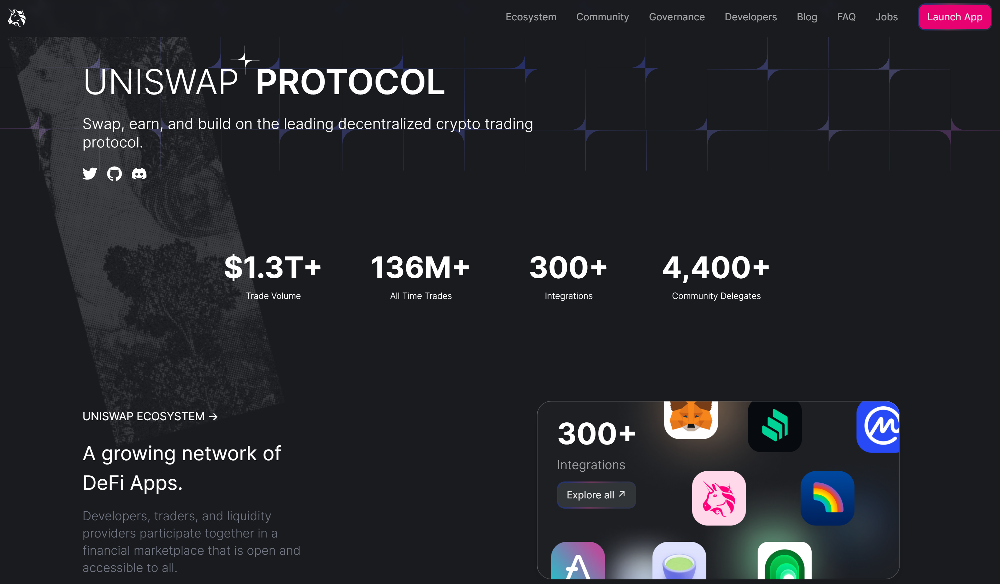 Uniswap 성장의 주요 동인 중 하나는 탈중앙화 금융(DeFi)에 대한 관심의 폭발입니다. DeFi는 사용자가 중앙 중개자 없이 금융 서비스에 액세스할 수 있도록 하는 블록체인 기술을 기반으로 하는 일련의 금융 애플리케이션을 말합니다. 많은 DeFi 애플리케이션이 유동성을 위해 Uniswap과 같은 분산형 거래소에 의존하는 가운데 Uniswap은 DeFi 생태계의 핵심 인프라 제공업체입니다.