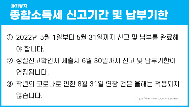 종합소득세 납부의 달이 다가오고 있습니다. 아마 국세청에서 카톡이나 메일로 “당신은 종합소득세 X종목입니다. 그래서인지 종합소득세 관련 검색량이 늘어나고 있는 것 같습니다 오늘은 지난번에 작성한 종합소득세 포스팅에 이어 종합소득세에 대해 알아보도록 하겠습니다. 누가 종합소득세를 내야 하는지, 이 세금이 어떻게 계산되는지, 언제 세금환급이 되는지, 세금환급은 언제인지, 납부기한, 연장방법, 중간예납에 대해서도 알아보겠습니다. *네이버 애드포스트 받기 다음 글을 꼭 읽어주세요. 애드포스트 수입 최고의 글입니다.