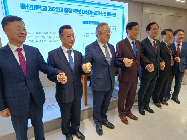 ▲ 손을 잡고 투표에 앞서 의견을 피력하는 후보들과 신앙계 관계자, 총신대 관계자. (왼쪽부터) 박성규 목사, 김성욱 교수, 오정호 부총장, 권순웅 총장, 문병호 교수, 김광열 교수, 김창훈 교수.
