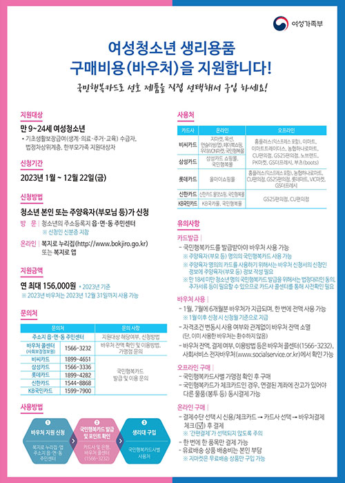 지원대상 : 9~24세* 저소득 여성청소년, 기초생활수급자(생활·의료·주거·교육), 저소득층, 한부모가족지원 수급자 지원금액 : 월 13,000원 -응모쿠폰 1월부터 6개월마다 결제금액 전액을 지급합니다. – 최대 금액을 받으려면 1월에 신청해야 합니다. 2월 이후에 신청하시면 신청한 달부터 바우처가 생성됩니다. <示例> 10월 15일 신청 시 13,000원 * 3개월 = 39,000원 바우처 포인트 지급 – 해당 바우처는 결제 후 2023년 12월 31일까지 사용 가능합니다.신청안내